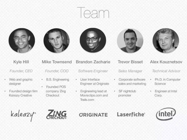 在这张幻灯片中,你要介绍你的团队、成员各自的职务和过去的经历。你要向投资人解释为什么你的团队是执行这个点子的最佳选择。