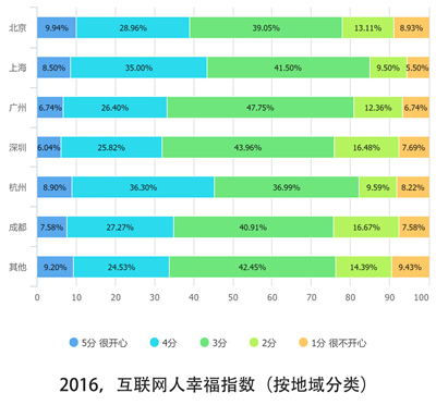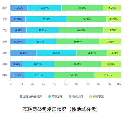杭州的小伙伴对待互联网大环境态度最乐观。1/4的杭州互联网人“感觉自己正坐在风口上分分钟要上天”。而在同项调查中,只有11%的北京互联网人表达了同样的看法,是各大城市中比例最低的。