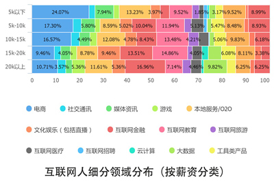 从总体来看,互联网人薪酬的中位数落在5k到10k这个范围内。只有14%的互联网人拿到了超过15k的高薪,依然有20%的互联网人月薪不到5k。