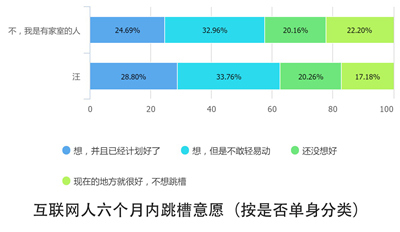 互联网人员流动快,一年一跳几乎成为常态。在调查中,超过六成的互联网人有在近六个月中跳槽的打算。只不过,其中一大半处于“想跳槽,而又不敢轻举妄动”的状态,只有27%的互联网人已经为跳槽大计做好了准备,并打算付诸实施。