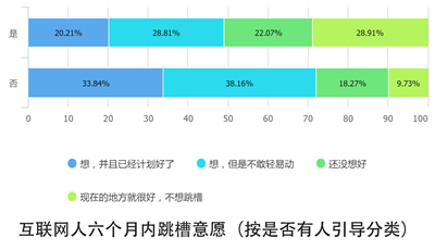 什么时候跳?工作1年以下的互联网人一般还没想好究竟是跳槽还是不跳,而工作1-3年的互联网人跳槽意愿最高。