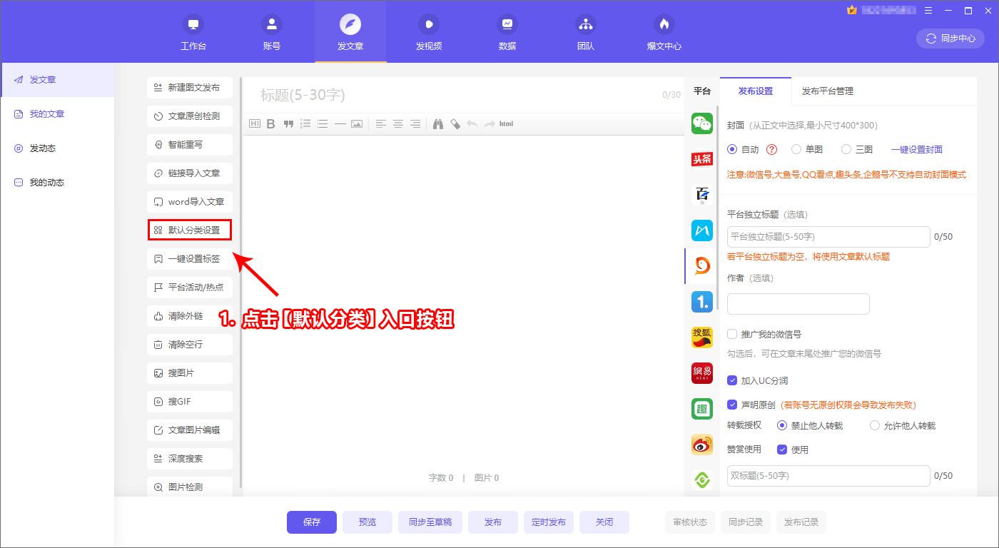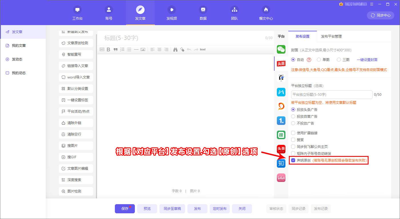 点击主导航【发文章】编辑好需要发布的内容。点击右侧平台栏,针对文章【所需发布平台的进行独立设置】设置时注意文字提示,有些平台某些项为必填项,必填项必须选择否则会导致发布不成功。