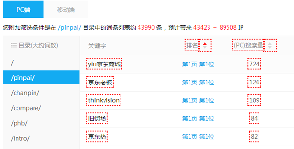 我们可以清晰的看到仅/pinpai/这个栏目页,就创建了仅 4 万条的关键词排名,预估可以带来4.3-8. 9 万个IP。可见,有效的优化电商网站的分类页面,从URL的角度给你带来源源不断的流量。
