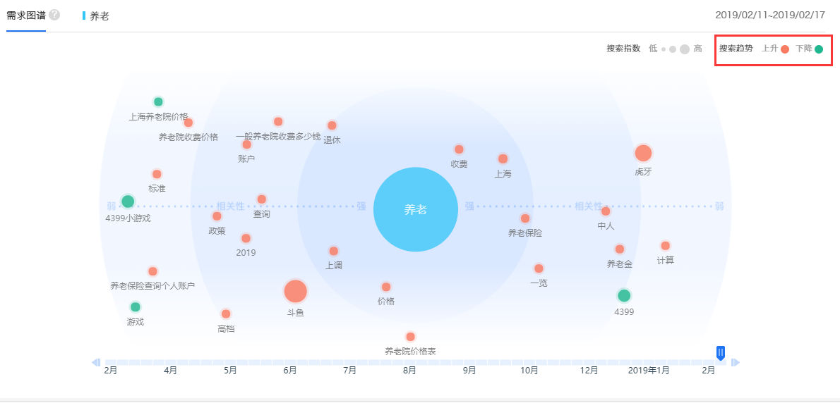 我们再来看一张图,需求图谱,这张可以看养老这个关键词相关需求趋势,这对你选取的方面具有一定的参考建议。