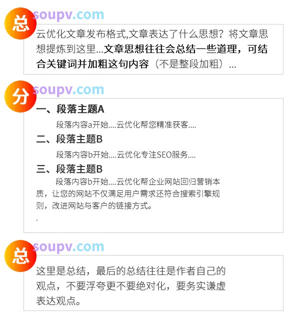 原创文章常见写作技巧一般采用总分总形式,不仅要提炼文章思想、总结概要,还要阐述作者的观点。围绕关键词扩充内容,让内容具备可读性和引导性。文章标题控制20个字以内,概要控制在80字内。文章字数控制在400字以上,要看文章内容是否切题,文章内容必须突出主次,条理清楚,段落层次的安排是否恰当等。文章思想是否明确,内容是否紧扣文章思想,对于有关联的内容,客通过关键词锚文本链接增加权重传递。优化文章的段落顺序、引用有关联的精美图片(一般用121x75的倍数)合理使用图片ALT属性。文章的段落及内容课使用